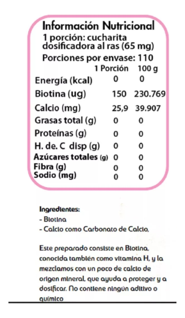 Biotina en polvo (Sobre 110 porciones)También conocida como Vitamina H, B7 o B8