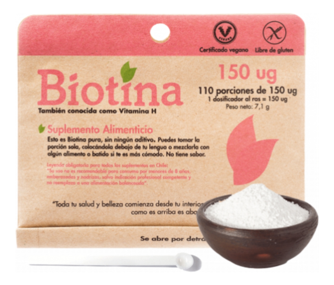 -110 porciones con 150 ug de Biotina-Incluye una mini cucharita dosificadora-Puedes tomar la porción sola colocándola debajo tu lengua (casi no tiene sabor y se disuelve en segundos) o mézclala con algún alimento o batido