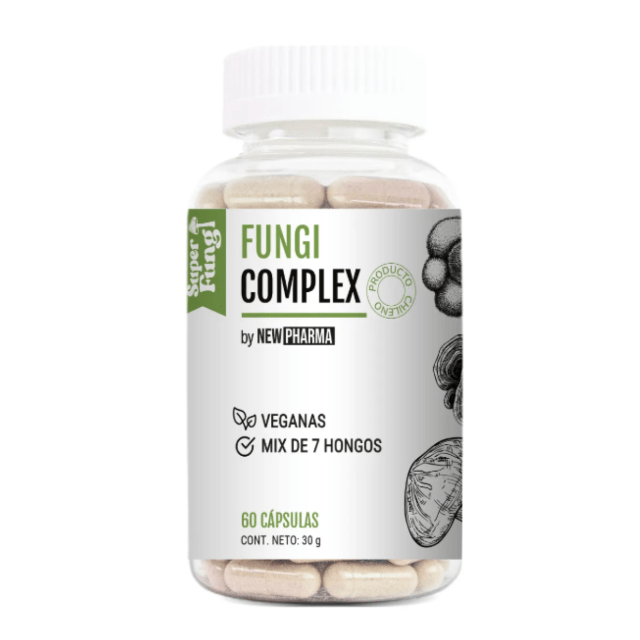 Fungi Complex de NewPharma es un complemento alimenticio en formato de cápsulas que combina 7 hongos funcionales (Shiitake, Maitake, Cordyceps, Melena de León, Cola de Pavo, Reishi y Chaga). ¡Mejora tu salud de manera natural y práctica con Fungi Complex!