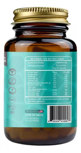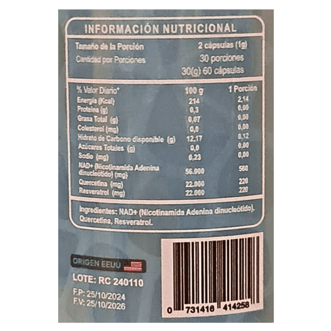 Este suplemento es una fórmula avanzada diseñada para promover la longevidad, aumentar la energía celular y apoyar la salud cardiovascular y antioxidante.